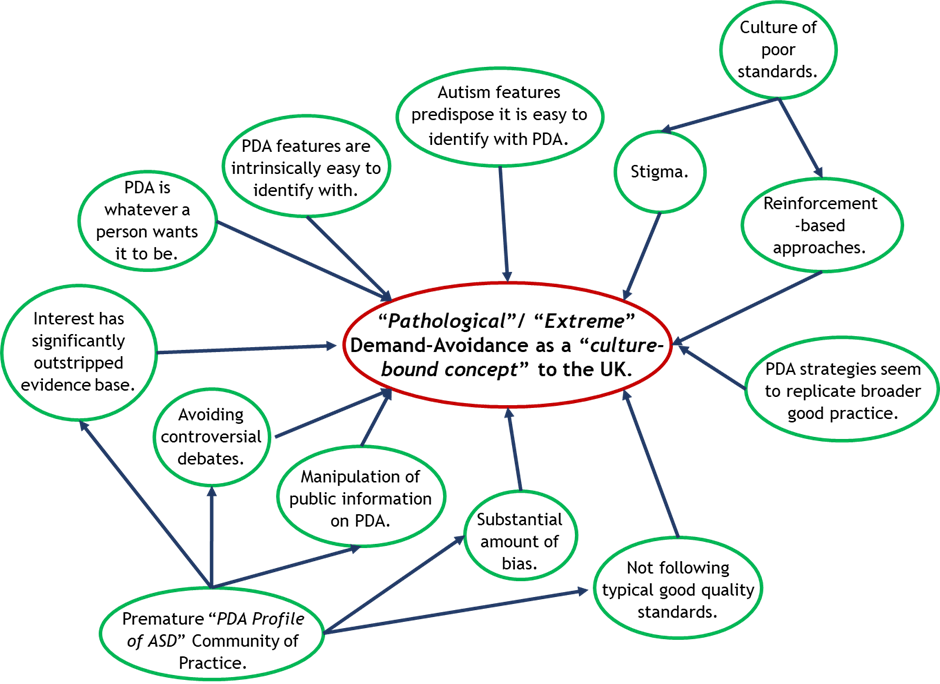 - Second main argument for PDA’s clinical need is that it has different strategies compared to autism. In this case that those with PDA do not respond well to traditional reinforcement-based approaches for autism (Newson et al, 2003; Christie, 2007; O’Nions and Neons, 2018), i.e., Applied Behavioural Analysis, and Positive Behaviour Support. Issue here is that those approaches are substantially contested, with autistic persons stating they are not effective (Milton, 2013). Recently, in the UK a report has said that Positive Behaviour Support should not be used with autistic persons (Gore et al, 2022). Additionally, non-autistic persons express demand-avoidance features for similar reasons to autistic persons, but are also exposed to reinforcement-based approaches (O’Nions and Neons, 2018). If one takes an inclusive approach to PDA, with a low diagnostic threshold, then surely, PDA is also needed to protect these non-autistic persons with PDA?