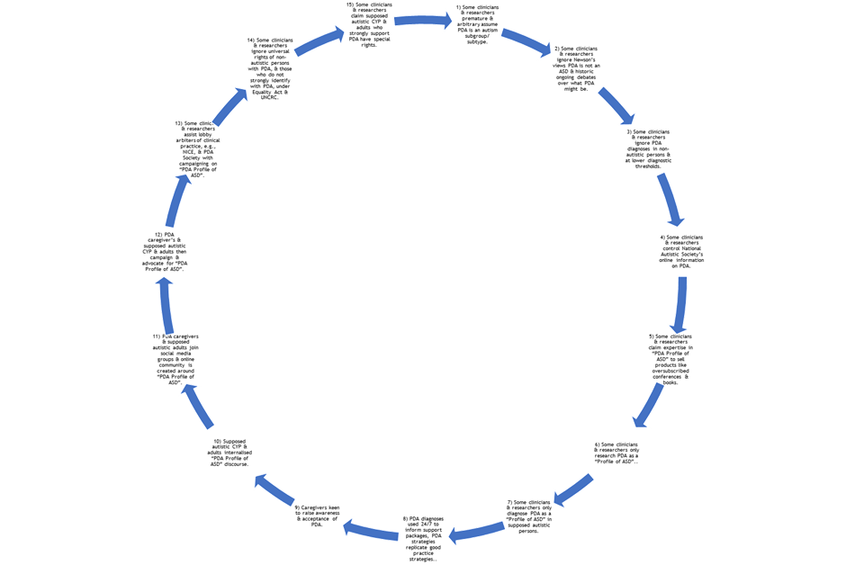 - The circularity is a problem. If one only diagnoses PDA in autistic persons, only develops tools for PDA in autistic persons and only conducts research of PDA in autistic persons; how we will be able to test competing views on PDA? How can we test if non-autistic persons with PDA exist? How can we test if non-autistic persons with PDA face similar/ same issues as autistic persons with PDA (thus should receive a PDA diagnosis)? How can we respect Disability law, and universal rights of non-autistic persons with PDA?