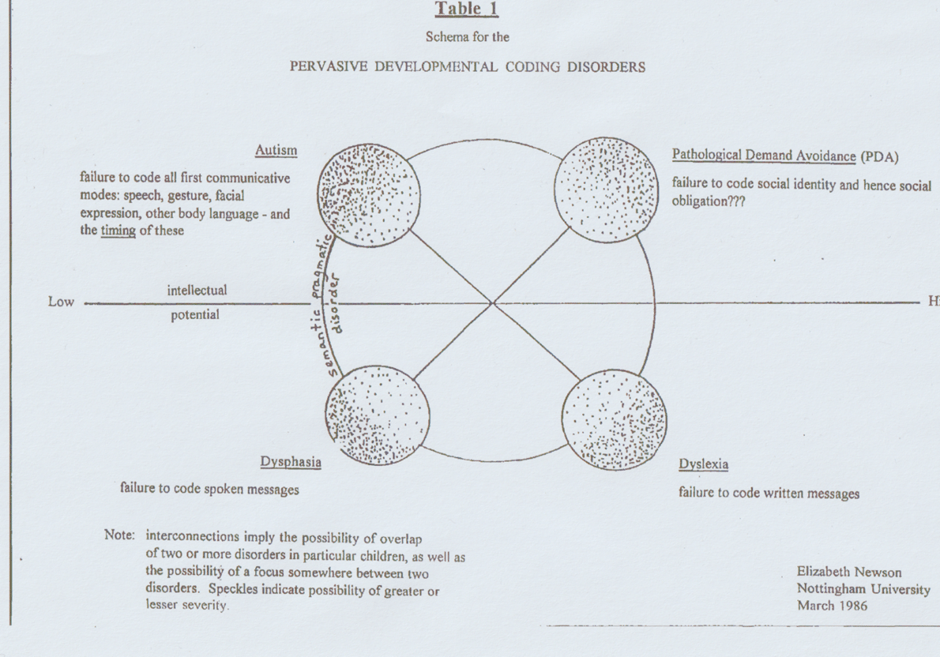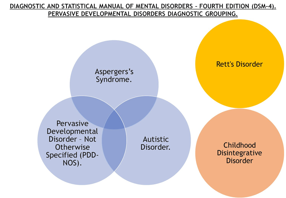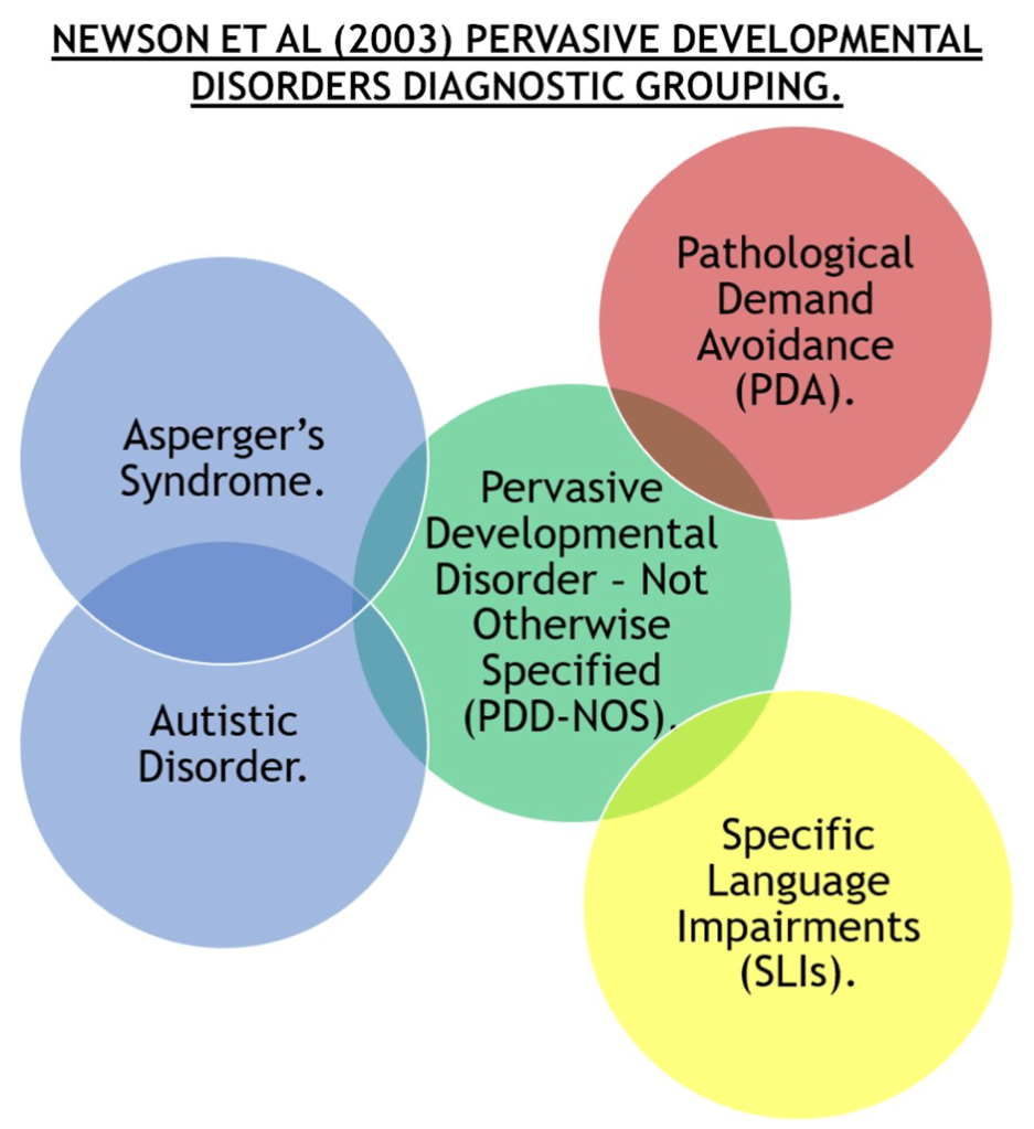 - Later Newson created her version of Pervasive Developmental Disorders diagnostic grouping (Newson et al, 2003, p599). Which is different from diagnostic grouping presented in the DSM-4 (APA, 1994). I will expand upon this later.